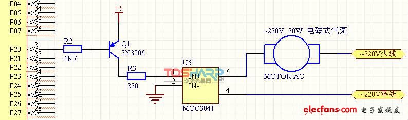 P1.0通過可控硅、交流接觸器、過流保護(hù)器和斷相保護(hù)器控制電機,圖中僅給出帶過零觸發(fā)的雙向晶閘管觸發(fā)電路。MOC3041為光耦合雙向可控硅驅(qū)動器,輸入端驅(qū)動電流為15mA,適用于220V交流電路。