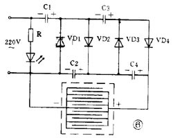 圖 6 是利用倍壓整流原理得到小電流直流高壓電的滅蚊蠅器。 220 伏交流經(jīng)過四倍壓整流后輸出電壓可達(dá) 1100 伏,把這個直流高壓加到平行的金屬絲網(wǎng)上。網(wǎng)下放誘餌,當(dāng)蒼蠅停在網(wǎng)上時造成短路,電容器上的高壓通過蒼蠅身體放電把蠅擊斃。蒼蠅尸體落下后,電容器又被充電,電網(wǎng)又恢復(fù)高壓。這個高壓電網(wǎng)電流很小,因此對人無害。