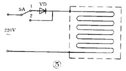 圖 5 是一個電熱毯電路。開關(guān)在“ 1 ”的位置是低溫檔。 220 伏市電經(jīng)二極管后接到電熱毯,因為是半波整流,電熱毯兩端所加的是約 100 伏的脈動直流電,發(fā)熱不高,所以是保溫或低溫狀態(tài)。開關(guān)扳到“ 2 ”的位置, 220 伏市電直接接到電熱毯上,所以是高溫檔。