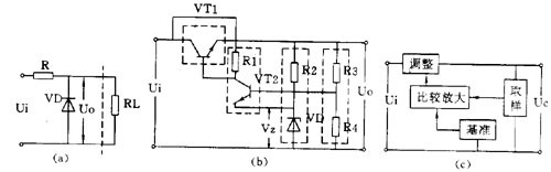 用一個穩(wěn)壓管和負(fù)載并聯(lián)的電路是最簡單的穩(wěn)壓電路,見圖 4 ( a )。圖中 R 是限流電阻。這個電路的輸出電流很小,它的輸出電壓等于穩(wěn)壓管的穩(wěn)定電壓值 V Z 。