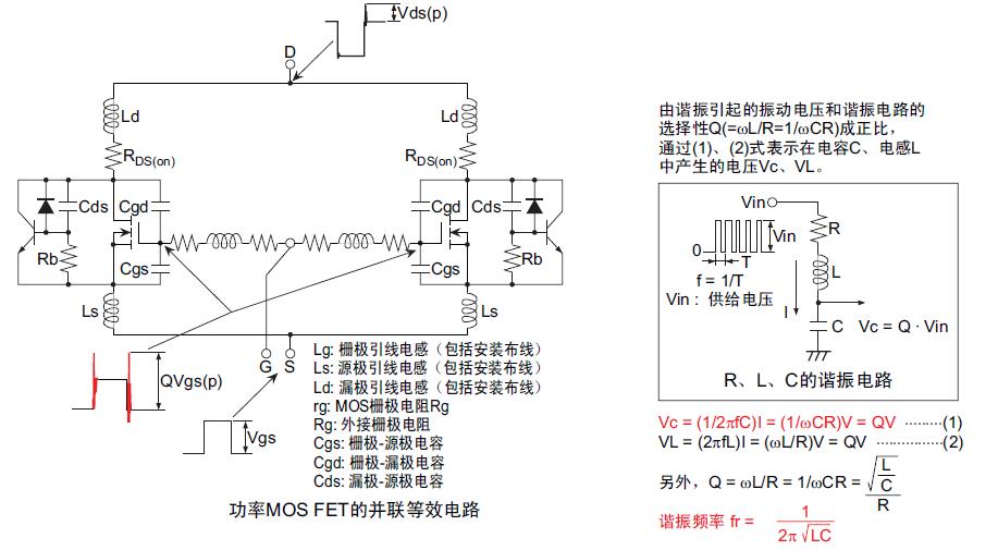 開漏極-源極電壓時(shí),在由柵極-漏極電容Cgd(Crss)和柵極引腳電感Lg形成的諧振電路上發(fā)生此寄生振蕩。當(dāng)諧振條件(ωL=1/ωC)成立時(shí),在柵極-源極間外加遠(yuǎn)遠(yuǎn)大于驅(qū)動(dòng)電壓Vgs(in)的振動(dòng)電壓,由于超出柵極-源極間額定電壓導(dǎo)致柵極破壞,或者接通、斷開漏極-源極間電壓時(shí)的振動(dòng)電壓通過柵極-漏極電容Cgd和Vgs波形重疊導(dǎo)致正向反饋,因此可能會(huì)由于誤動(dòng)作引起振蕩破壞。