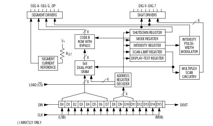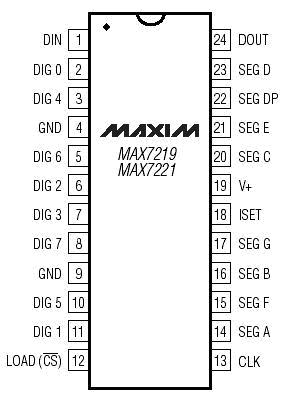 The MAX7219/MAX7221 are compact, serial input/output common-cathode display drivers that interface microprocessors (µPs) to 7-segment numeric LED displays of up to 8 digits, bar-graph displays, or 64 individual LEDs. Included on-chip are a BCD code-B decoder, multiplex scan circuitry, segment and digit drivers, and an 8x8 static RAM that stores each digit. Only one external resistor is required to set the segment current for all LEDs. The MAX7221 is compatible with SPI™, QSPI™, and MICROWIRE™, and has slew-rate-limited segment drivers to reduce EMI.