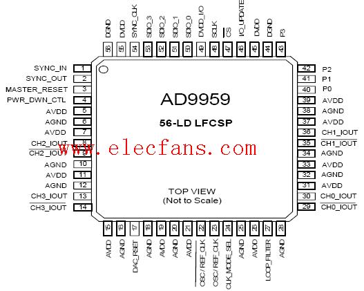 2 SYNC_OUT O Used to synchronize multiple AD9959s. Connect to the SYNC_IN pin of the slave AD9959.