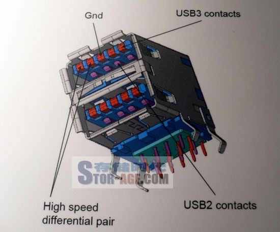 為了向下兼容2.0版,USB 3.0采用了9針腳設計,其中四個針腳和USB 2.0的形狀、定義均完全相同,而另外5根是專門為USB 3.0準備的,這也算得上一種Combo方案吧。