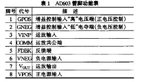 AD603 的引腳排列如圖1 所示,表1 所列為其