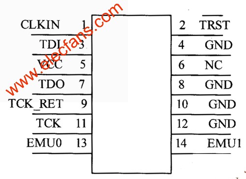 連接測試組(JTAG,Joint Test Action Group)接口用于連接最小系統(tǒng)板和仿真器,實現(xiàn)仿真器對DSP的訪問,JTAG接口的連接需要和仿真器上的接口一致。不論什么型號的仿真器,其JTAG接口都滿足IEEE 1149.1的標準。滿足IEEE 1149.1標準的14腳JTAG接口如圖1所示。