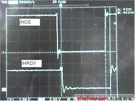 在案例中,用示波器觀察HCS 與HRDY 之間的時序關(guān)系,發(fā)現(xiàn)HCS 的上升沿在HRDY 的上升沿之前,即主機(jī)在HPI 數(shù)據(jù)有效之前結(jié)束了訪問周期。HRDY 的上升沿其實(shí)是因?yàn)镠CS 的結(jié)束而拉高的,并非數(shù)據(jù)真正有效。