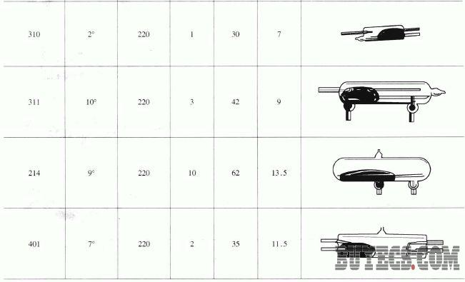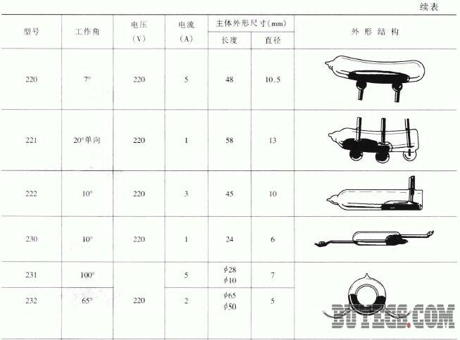 玻璃管封裝式水銀開關(guān)的品種很多,約有10 種以上,表9-16 列出了其中一些水銀開關(guān)的特性參數(shù)及外形結(jié)構(gòu),供讀者選擇使用。