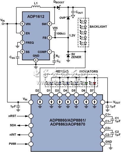 圖1. 升壓轉(zhuǎn)換器ADP1612和LED驅(qū)動器ADP8860實現(xiàn)背光和輔助LED 的可編程驅(qū)動。
