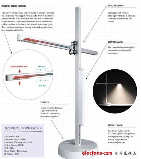 “一個(gè)純銅熱導(dǎo)管貫穿在臺燈的支臂中,并和將熱量傳送到周圍空氣的鋁質(zhì)散熱片相通,因?yàn)殂~是最快的熱導(dǎo)體,最終加快熱管內(nèi)不斷的循環(huán)冷卻,”戴森解釋說。