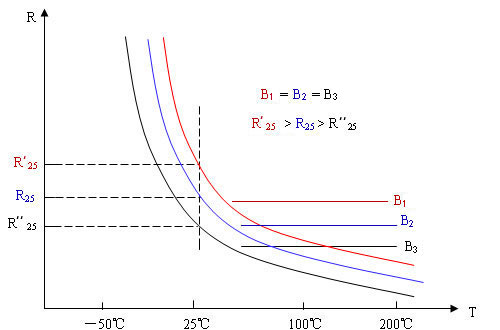 相同阻值,不同B值的NTC熱敏電阻R-T特性曲線示意圖