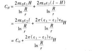 上式中:ε1-被測(cè)液體的相對(duì)介電常數(shù);ε2-氣相介質(zhì)的相對(duì)介電常數(shù);H-電容傳感器浸入液體的深度(m);l-電容傳感器垂直高度(m);R-內(nèi)極板圓柱底面半徑(m);r-外極板圓柱底面半徑(m)。由于R、r、l等都是固定值,只要利用ε1、ε2、CH就能計(jì)算出液位H。圖4—2是用于測(cè)量導(dǎo)電液體的電容法原理[4],其公式推導(dǎo)略。電容式液位儀價(jià)格較低,安裝容易,且可以應(yīng)用于高溫、高壓的場(chǎng)合。但電容液位儀測(cè)量重復(fù)精度較低,需定期維修和重新標(biāo)定,工作壽命也不是很長(zhǎng)。