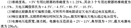 1、內(nèi)含4個專用電壓比較器和一個輔助電壓比較器。前者分別監(jiān)視+5V、-5V、+12V、-12V穩(wěn)壓電源的欠電壓狀態(tài),后者可對其他電壓進(jìn)行監(jiān)視。所有比較器均為漏極開路輸出,并具有滯后特性,可防止受處界干擾而發(fā)生的振蕩。