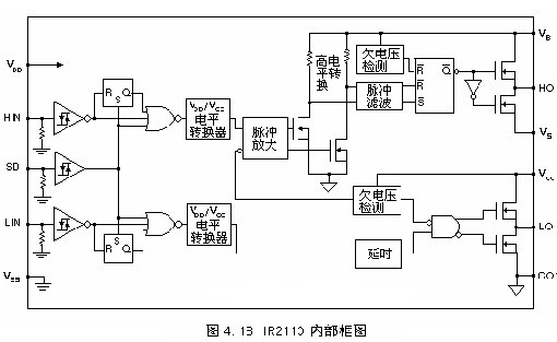IR2110內部功能由三部分組成:邏輯輸入;電平平移及輸出保護。如上所述IR2110的特點,可以為裝置的設計帶來許多方便。尤其是高端懸浮自舉電源的設計,可以大大減少驅動電源的數目,即一組電源即可實現對上下端的控制。