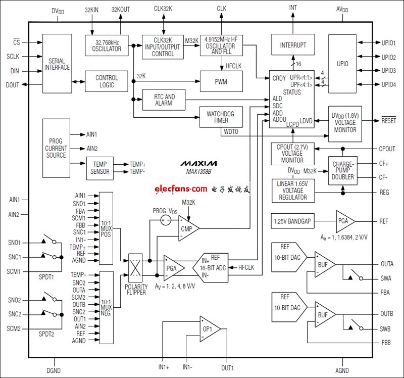 MAX1358B帶有兩路10:1差分輸入復(fù)用器(mux),可接受0至AVDD的信號電平。片上1倍至8倍可編程增益放大器(PGA)用于測量低壓信號,減少了所需的外部電路。