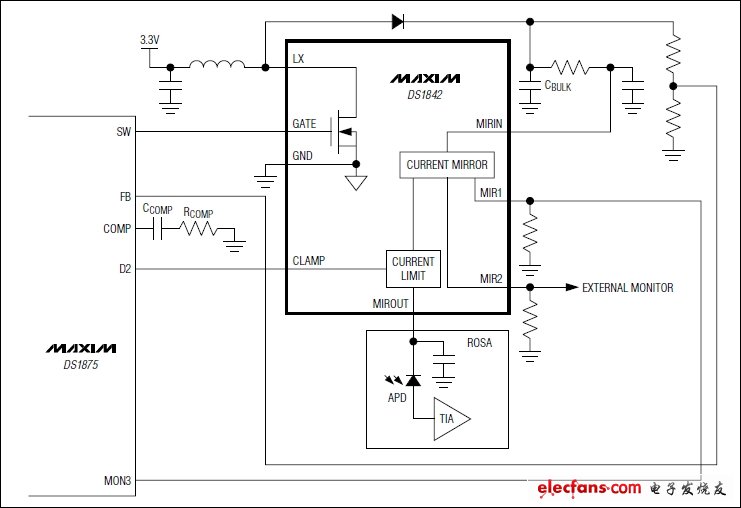 DS1842集成了雪崩光電二極管(APD)偏置和監(jiān)測應(yīng)用所必需的分立高壓元件。開關(guān)FET結(jié)合外部DC-DC控制器一起使用,構(gòu)成一個升壓型DC-DC轉(zhuǎn)換器。電流鉗位功能限制通過APD的電流,且?guī)в型獠筷P(guān)斷功能。該器件還具有雙電流鏡功能,以監(jiān)測APD電流。