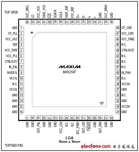 MAX2597工作在-40°C至+85°C擴(kuò)展級(jí)溫度范圍,采用帶裸焊盤(EP)的9mm x 9mm x 1.4mm fcLGA封裝。