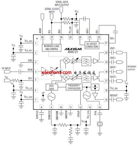 MAX2121低成本,直接變頻調(diào)諧器IC是專為衛(wèi)星機(jī)頂盒和VSAT應(yīng)用。該裝置直接轉(zhuǎn)換到基帶的LNB的衛(wèi)星信號,使用寬帶I / Q下變頻器 。工作頻率范圍從925MHz至2175MHz。 設(shè)備包括LNA和RF可變增益放大器,I和Q下變頻混頻器,基帶低通濾波器和數(shù)字控制的基帶可變增益放大器 ??傊?a href="http://www.greenbey.cn/v/tag/105/" target="_blank">射頻和基帶可變增益放大器的增益控制范圍,提供超過 80分貝設(shè)備包括了單片VCO,以及一個(gè)完整的分?jǐn)?shù)N頻率合成器。此外,一個(gè)芯片上的晶體振蕩器提供了一個(gè)用于驅(qū)動(dòng)額外的調(diào)諧器和解調(diào)器的緩沖輸出。合成器的編程和設(shè)備配置完成一個(gè)2線串行接口。該IC具有一個(gè)VCO自動(dòng)選擇(VAS)功能,可自動(dòng)選擇適當(dāng)?shù)腣CO。多調(diào)諧器應(yīng)用,該設(shè)備可以配置為兩個(gè)2線接口地址之一。一個(gè)低功耗待機(jī)模式,屆時(shí)信號路徑被關(guān)閉,而離開的參考振蕩器,數(shù)字接口,以及緩沖電路的積極,提供了一個(gè)方法,以減少單一和多調(diào)諧器 應(yīng)用的功率。甚小孔徑終端設(shè)備是最先進(jìn)的寬帶/ DBS調(diào)諧器可用。低噪聲系數(shù),消除了外部LNA的需要。一個(gè)無源元件的小型數(shù)量,需要形成一個(gè)完整的寬帶衛(wèi)星調(diào)諧器DVB - S2的RF前端解決方案 。調(diào)諧器是在為一個(gè)非常小的,的5mm x 5毫米,28引腳薄型QFN封裝 。